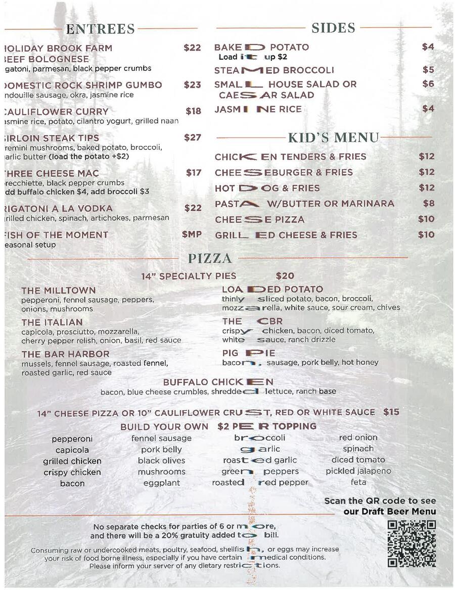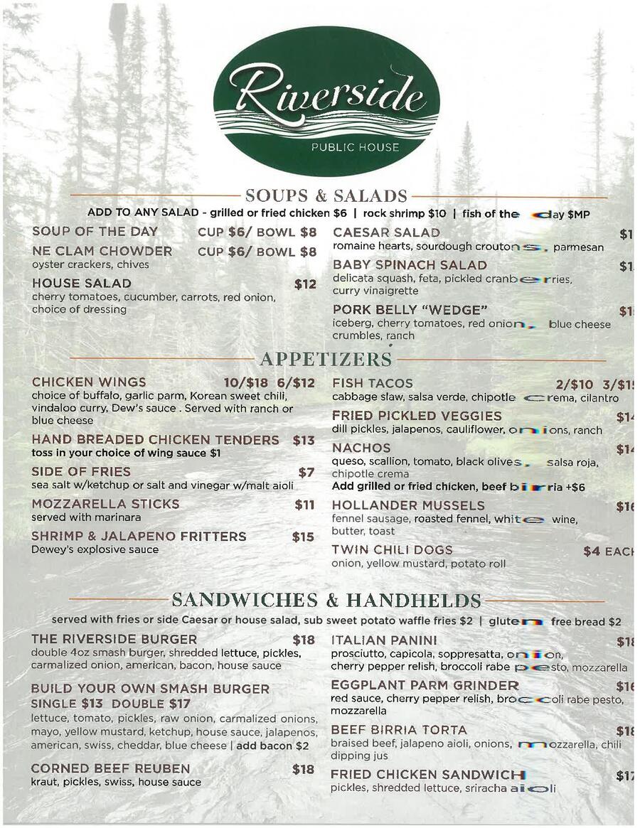 Nestled in the heart of Dalton, MA, Riverside Public House exudes warmth and welcomes guests with open arms. With its cozy atmosphere, friendly staff, and a menu bursting with mouthwatering dishes, it's the perfect place to unwind and savor a delightful meal. Our diverse menu caters to every palate, whether you're looking for a leisurely dinner with loved ones, a quick lunch catch-up with friends, or a solo meal at the bar. Riverside Public House offers a relaxed setting where laughter flows as freely as the conversation. Come as you are, and leave with a satisfied heart, a satisfied appetite, and a smile!