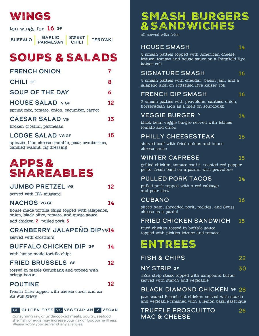 From burgers and sandwiches to post-run meals, our menu’s got something for everyone, no matter the occasion! Dig into some nachos at the bar, kick back with a cocktail on the couch, or enjoy mountainside views over a tasty fried chicken sandwich.